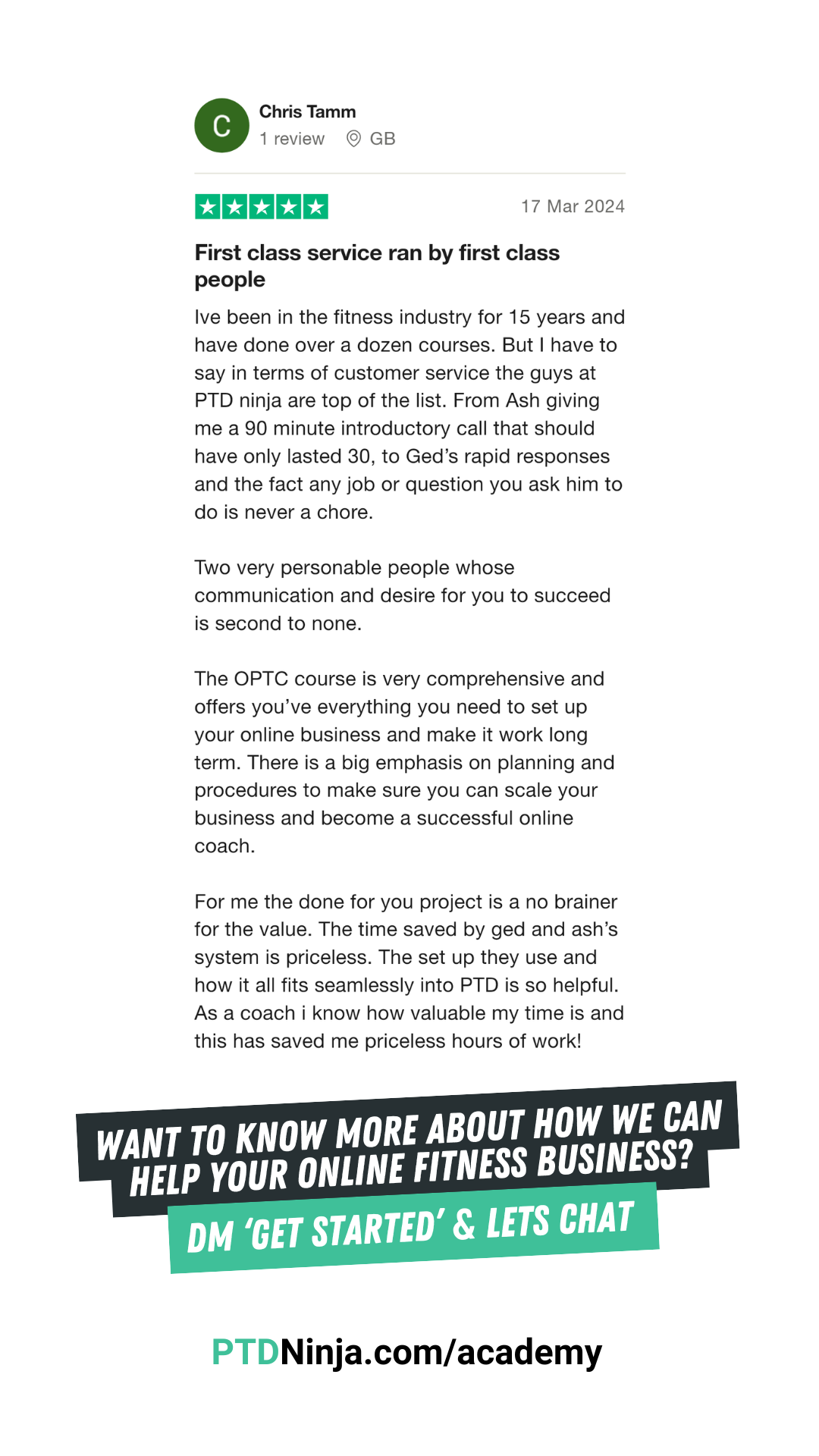 PTD Ninja Ltd. offers a variety of services aimed at supporting personal trainers in establishing and growing their online fitness businesses, including PT Distinction Masterclasses, Done For You services, Online Personal Training Certification, FitPro LaunchPad, and Online Cash Injector. Outcomes such as client acquisition and income are illustrative based on our data and are not guaranteed.