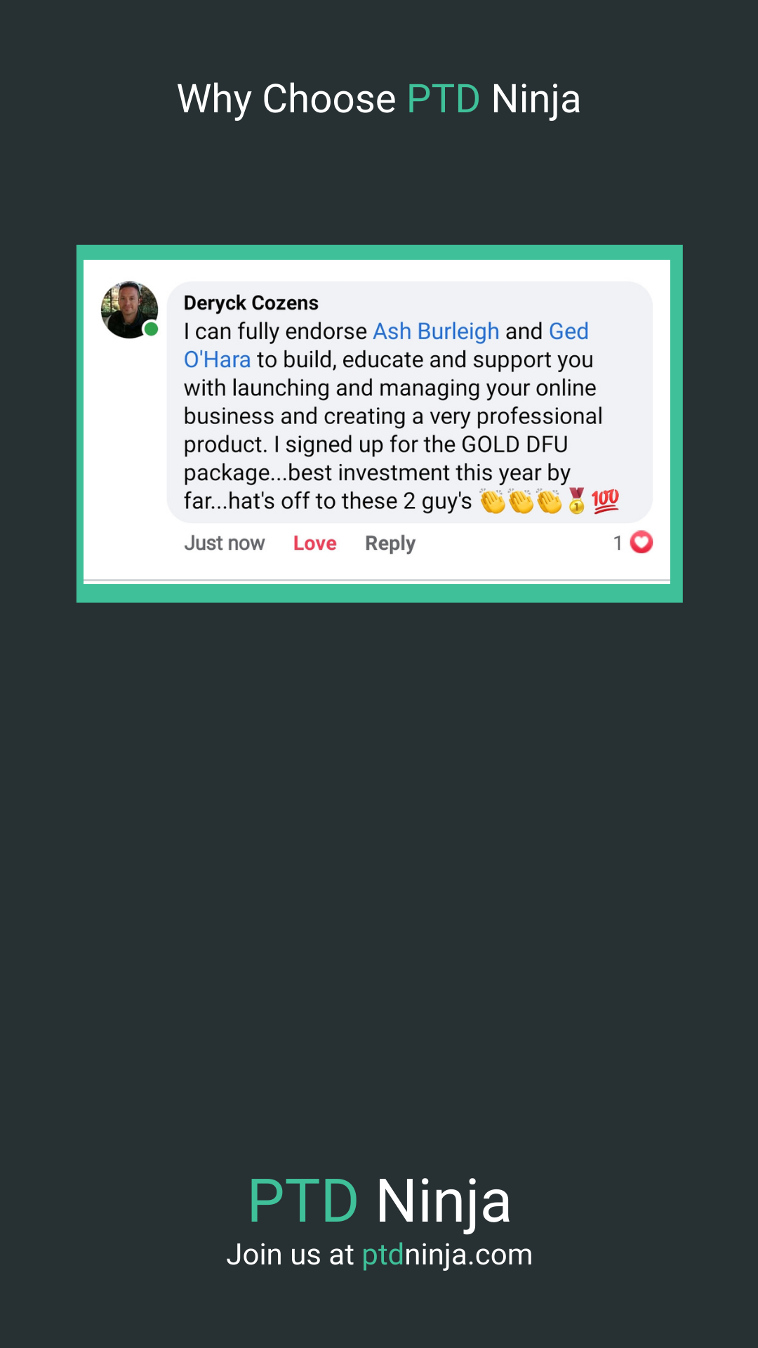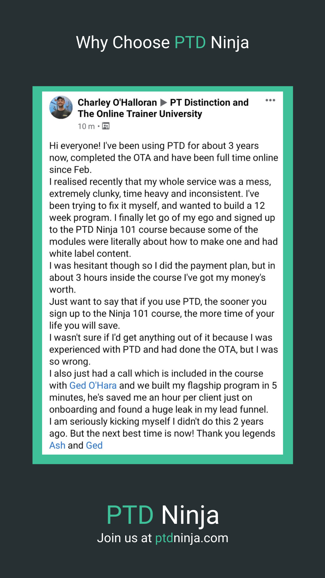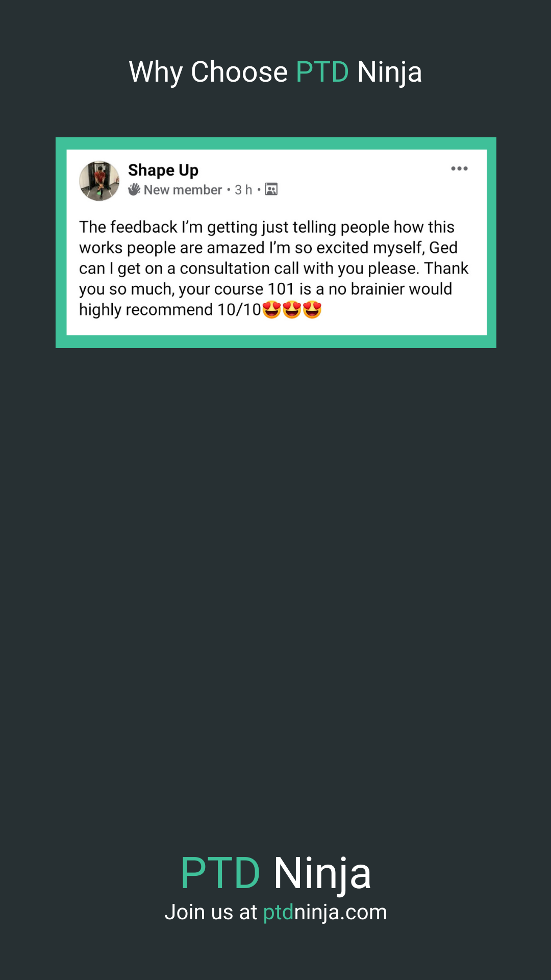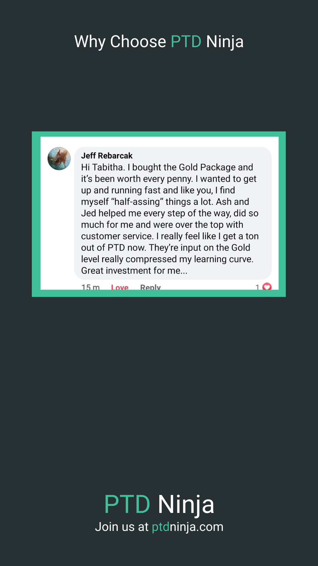So, why settle for less? I won't palm you offer to a 'coach' or 'team member' with PTD Ninja, you work direclty with me.